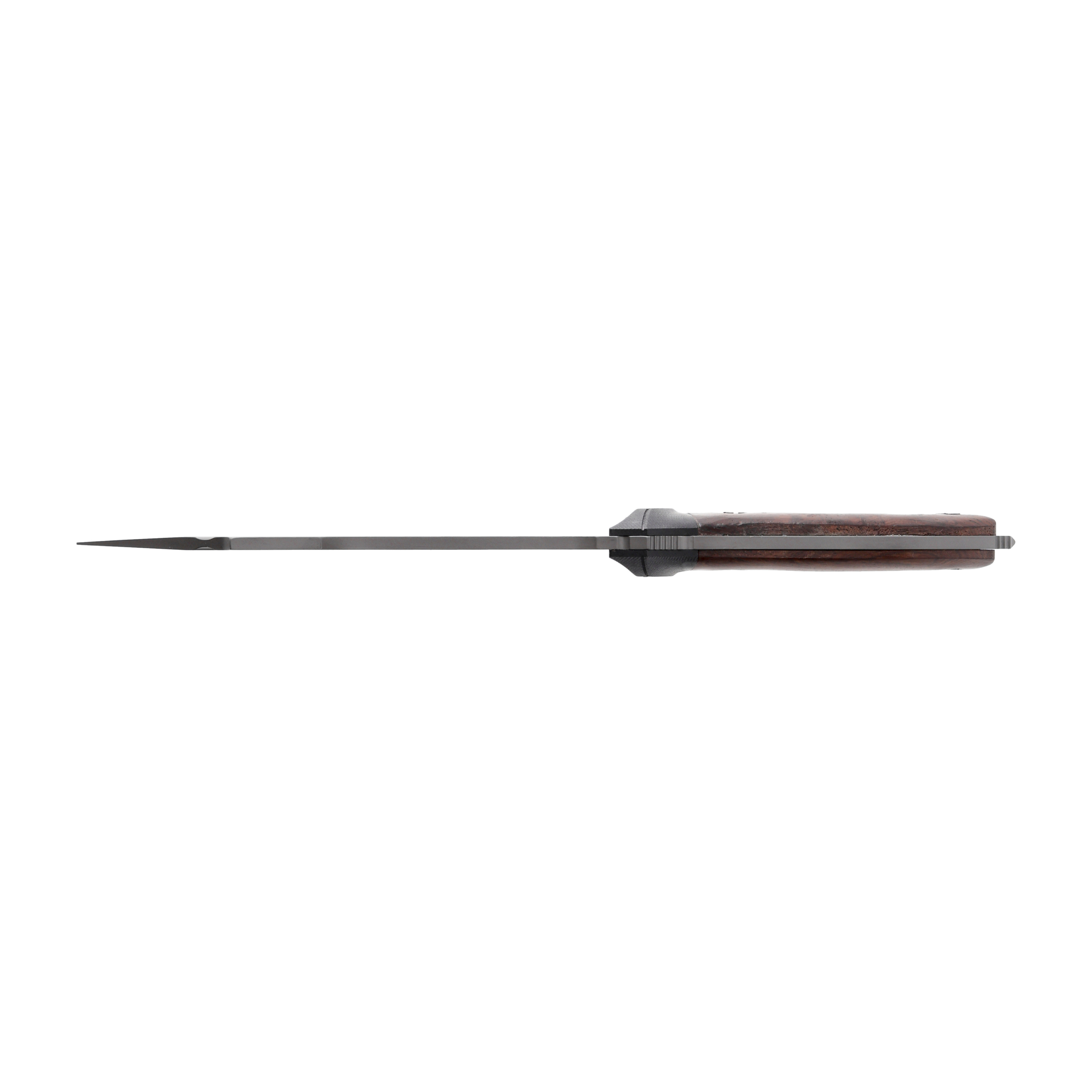 Rękojeść noża wykonano z 2 materiałów: odpornego laminatu G10 (obustronny jelec chroniący dłoń przez zsunięciem na ostrze) oraz drewna orzechowego, z którego powstały profilowane okładziny. W wystającym trzpieniu znajduję się otwór, który pozwala na wplecenie linki lub rzemienia.