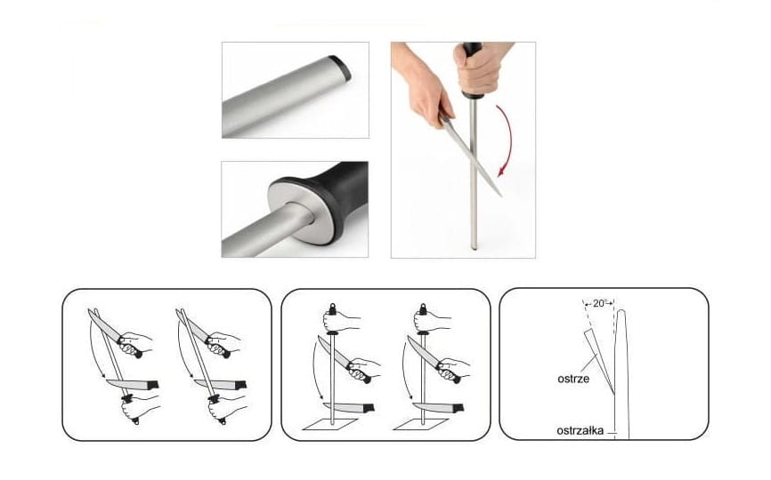 Zachowując odpowiedni kąt ostrzenia (najlepiej 20°) naostrz nóż przesuwając go od rączki do końca ostrzałki.