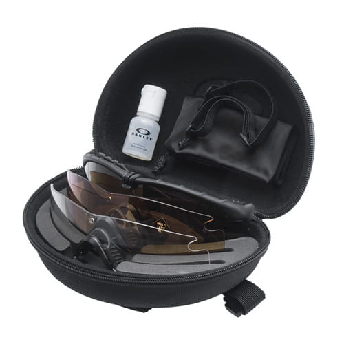 W komplecie znajduje się: - Oprawka - Wizjer Clear (zamontowany) - Wizjer Grey - Wizjer Persimmon - Woreczek z mikrofibry do przechowywania i czyszczenia okularów - Płyn Oakley Anti-Fog wraz ze ściereczką / pokrowcem na butelkę z płynem - Zapinane zamkiem błyskawicznym sztywne nylonowe etui na cały zestaw - jest ono wyposażone w kompozytowy karabinek oraz montaż do paska.