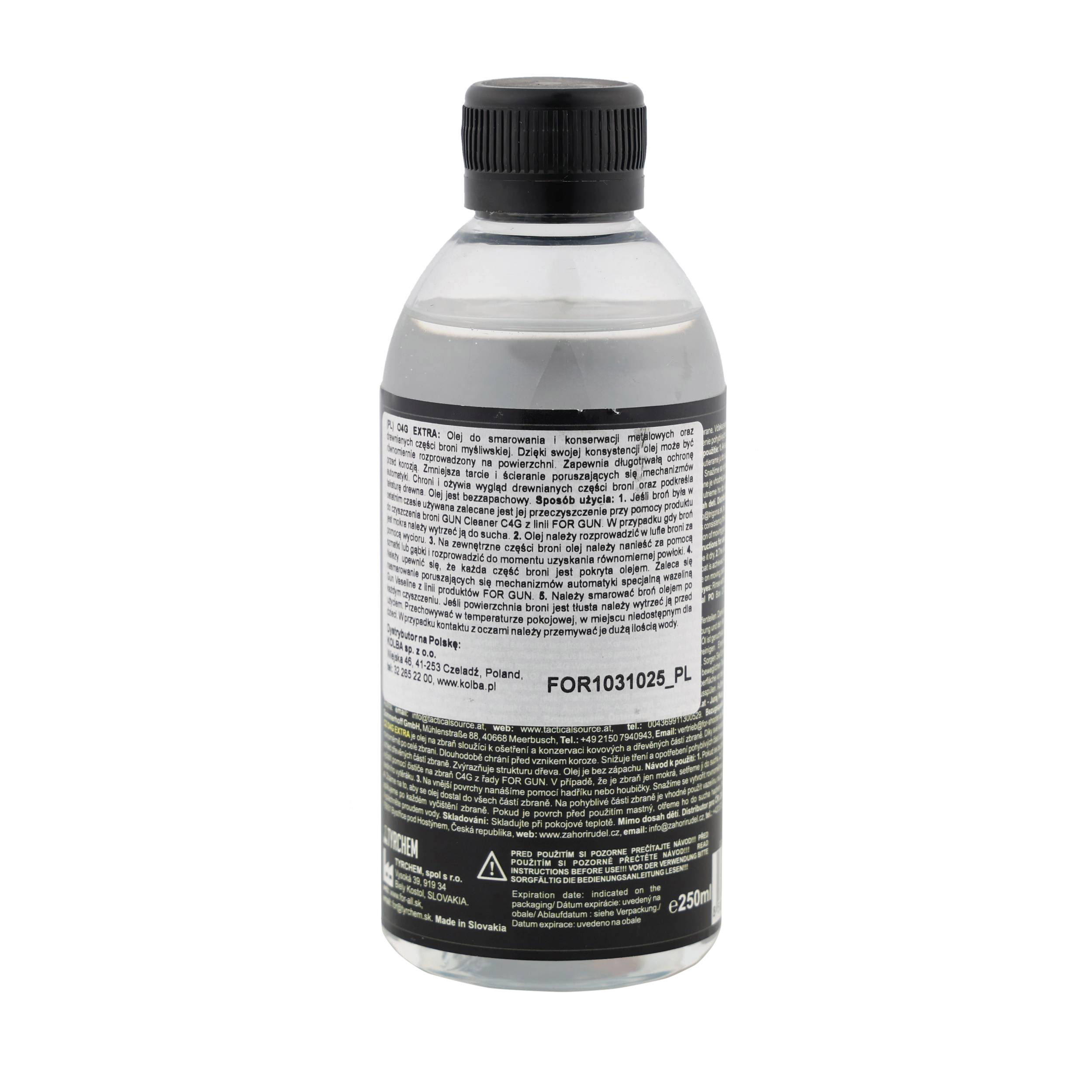 FOR O4G Extra to uniwersalny olej do konserwacji i smarowania, stworzony z myślą o najwyższej ochronie zarówno metalowych, jak i drewnianych elementów broni. Dzięki doskonałej konsystencji równomiernie rozprowadza się po powierzchni, docierając nawet do trudno dostępnych miejsc. Regularne stosowanie preparatu zapewnia długotrwałą ochronę przed korozją i gwarantuje niezawodność działania każdego mechanizmu.