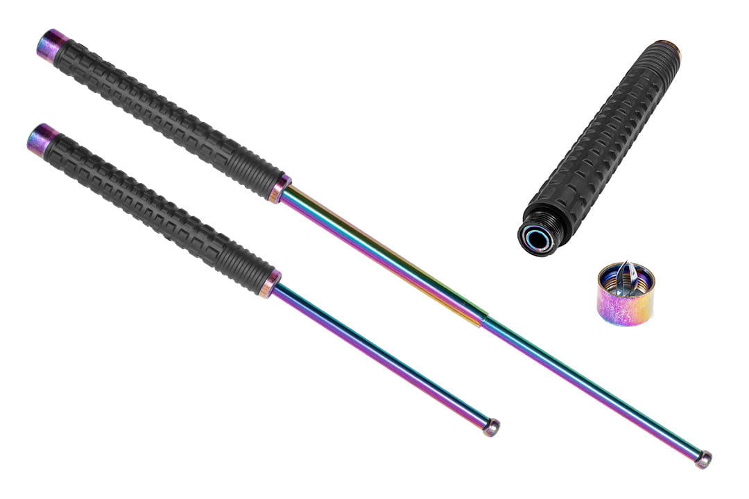 Elementy rozkładane pałki są w kolorze tęczowym, co nadaje jej wyjątkowy, efektowny wygląd. Wielokolorowe refleksy przyciągają wzrok, dodając pałce unikalnego charakteru, a jednocześnie zapewniają wysoką odporność na otarcia wynikające ze składania oraz na uszkodzenia powstające podczas uderzeń. Rękojeść z antypoślizgowej, syntetycznej gumy z wypustkami gwarantuje pewny, wygodny chwyt i skutecznie zapobiega ślizganiu się dłoni, nawet podczas intensywnego użytkowania.
