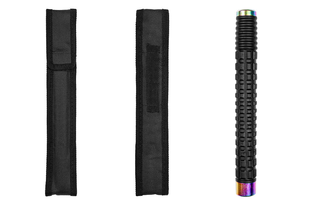 Elementy rozkładane pałki są w kolorze tęczowym, co nadaje jej wyjątkowy, efektowny wygląd. Wielokolorowe refleksy przyciągają wzrok, dodając pałce unikalnego charakteru, a jednocześnie zapewniają wysoką odporność na otarcia wynikające ze składania oraz na uszkodzenia powstające podczas uderzeń. Rękojeść z antypoślizgowej, syntetycznej gumy z wypustkami gwarantuje pewny, wygodny chwyt i skutecznie zapobiega ślizganiu się dłoni, nawet podczas intensywnego użytkowania.