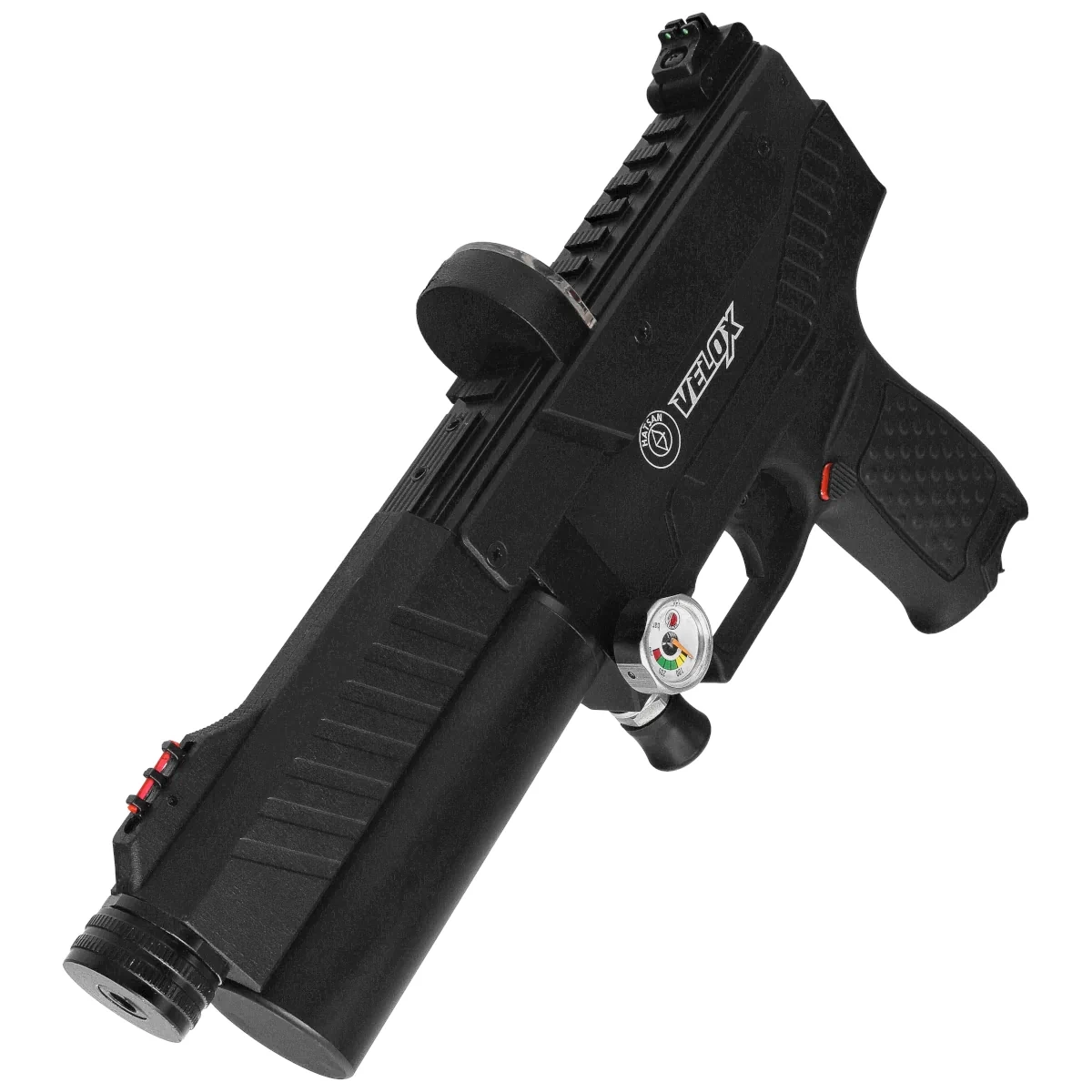 Velox posiada podwójną szynę 11 mm i 22 mm, która umożliwia montaż różnych akcesoriów, a regulowany system celowniczy z trzema światłowodowymi punktami optycznymi (Tru-Glo) umożliwia łatwe celowanie. Ergonomiczny design zapewnia maksymalny komfort użytkownika, a dodatkowy magazynek można przechowywać w specjalnym uchwycie umieszczonym pod chwytem, co umożliwia płynne oddawanie kolejnych strzałów. Velox wyposażony jest w manualny bezpiecznik umieszczony na chwycie pod kciukiem.