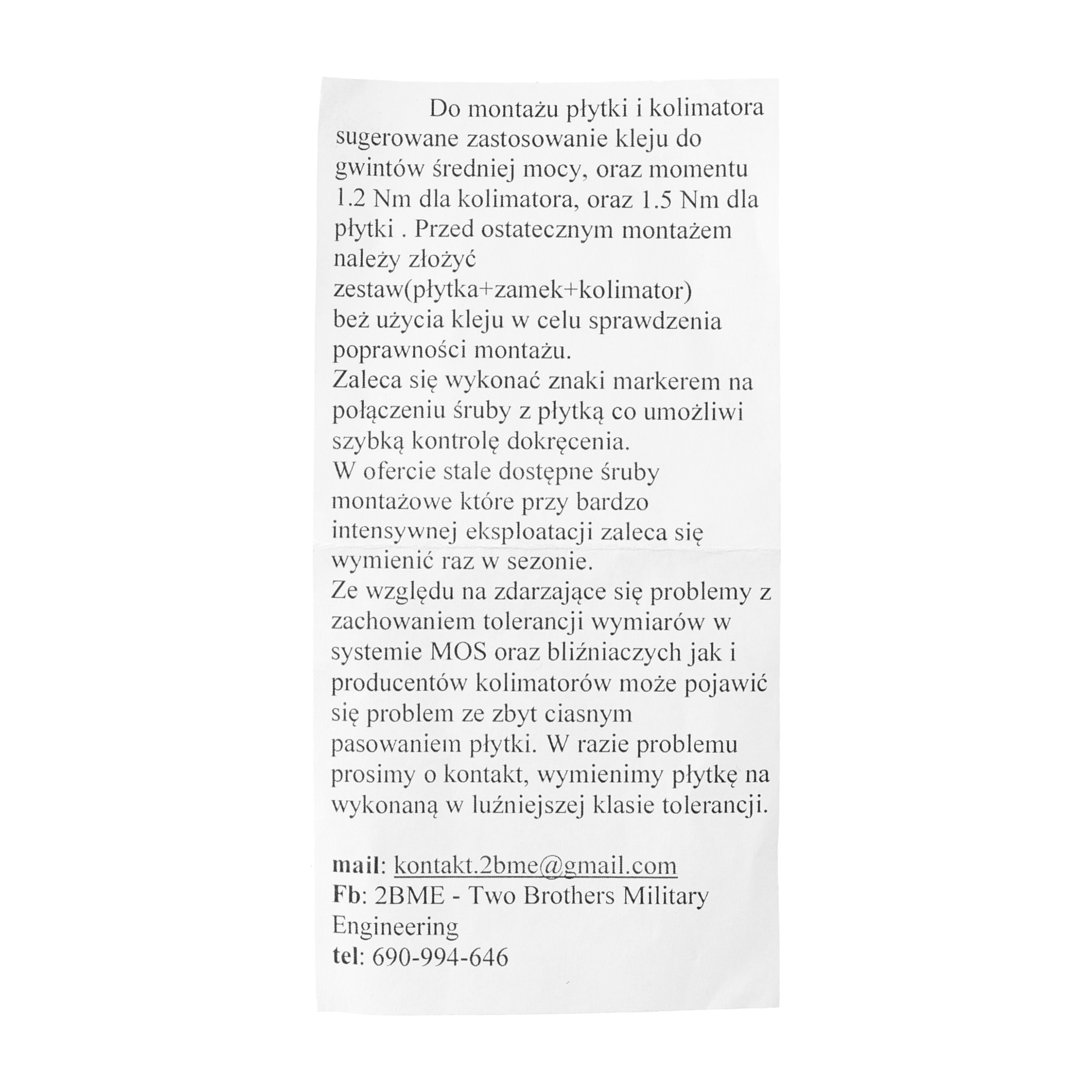 Do montażu płytki i kolimatora zaleca się stosowanie kleju do gwintów o średniej mocy (w zestawie) oraz używania klucza dynamometrycznego z nastawą 1,2 nm. Przed ostatecznym montażem warto zamocować kompletną płytkę (z gwintowanymi wkładkami) i kolimator bez użycia kleju. Dzięki takiej weryfikacji mamy pewność, że płytka jest odpowiednio dopasowana do kolimatora i broni.