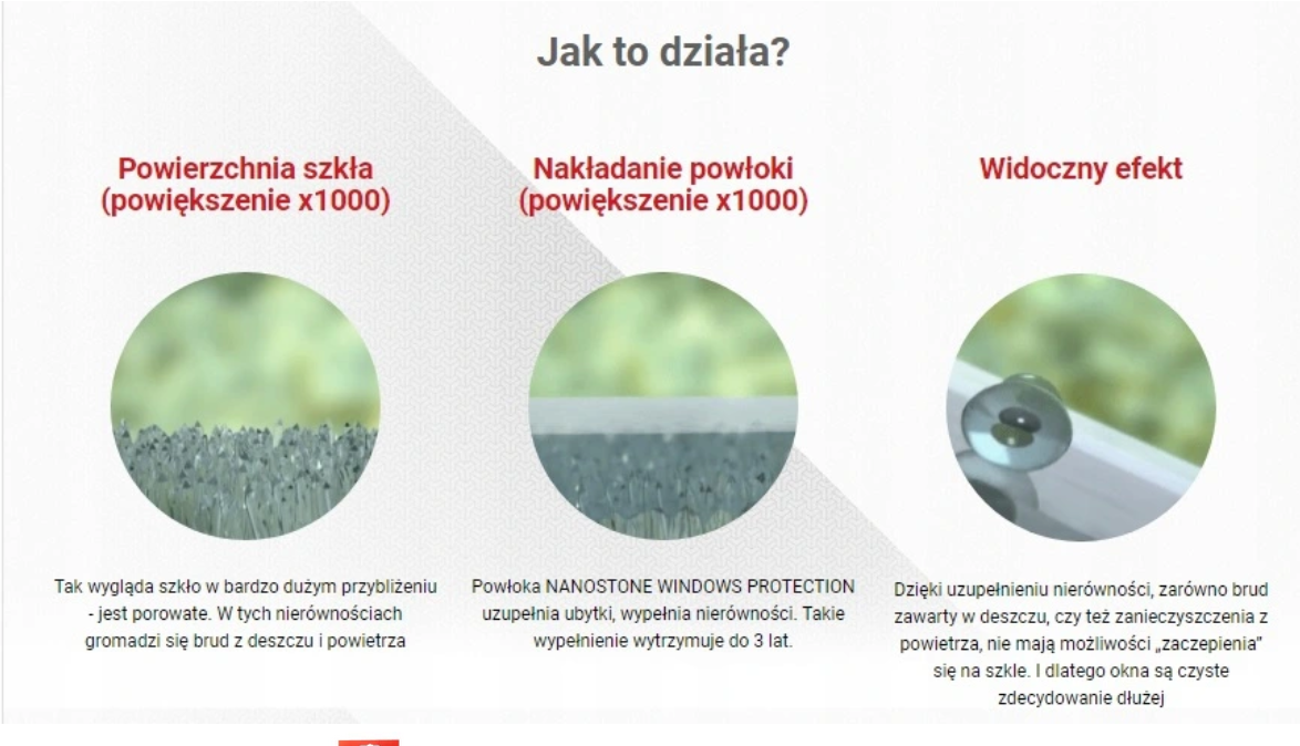 Kompletne rozwiązanie problemów z zabrudzeniami na oknach, szybach i innych elementach szklanych. Dzięki zastosowaniu nanocząsteczek kwarcu materiał staje się superhydrofobowy - czyli odporny na wodę i zabrudzenia.