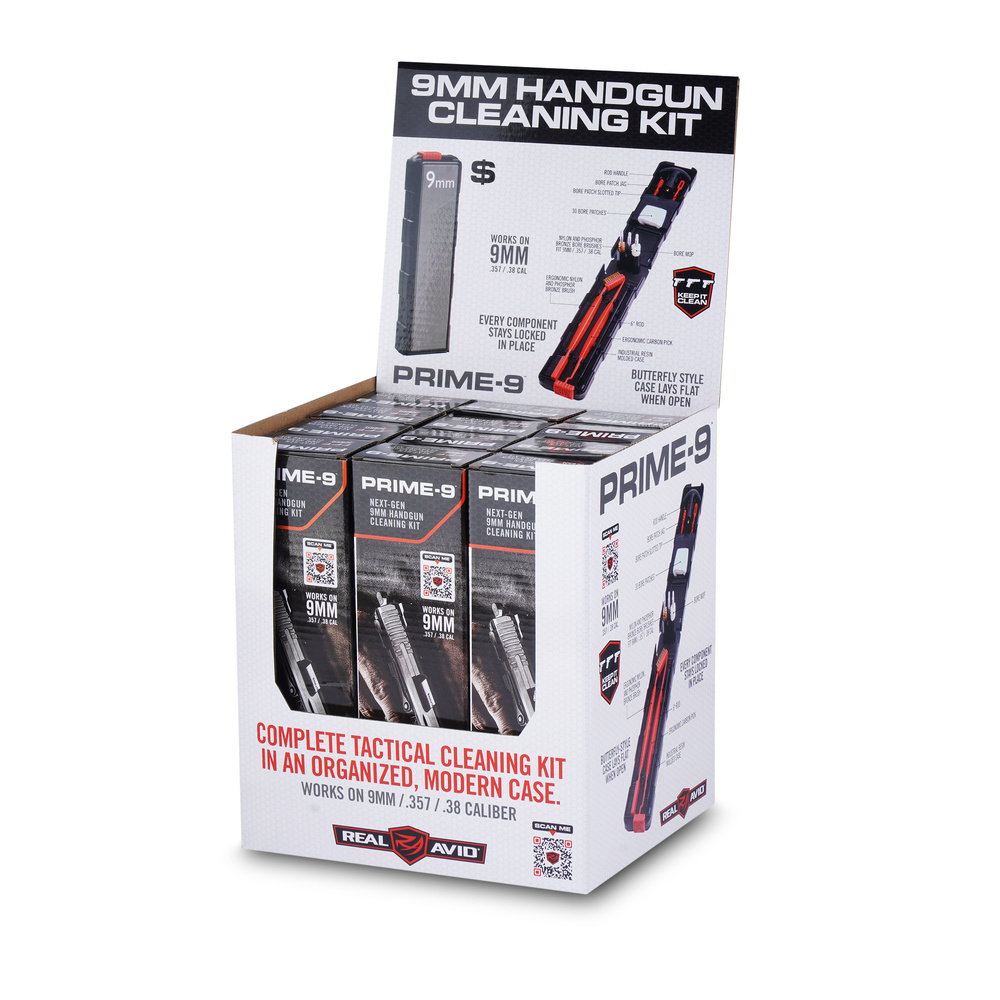 Real Avid - 12 zestawów z ekspozytorem do czyszczenia broni Prime-9 - .357/.38/9 mm - AVGCK9MM-12D