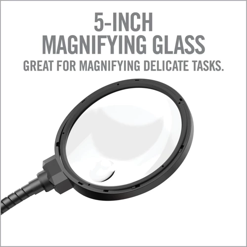 Posiada 5-calową lupę zapewniającą doskonałą widoczność drobnych elementów, uchwyt na telefon komórkowy pozwalający na nagrywanie lub oglądanie instrukcji podczas pracy, oraz lampę roboczą LED o mocy 180 lumenów zapewniającą doskonałe oświetlenie obszaru roboczego.