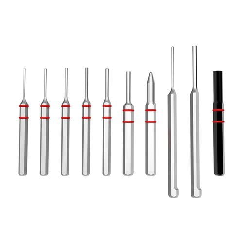 - 10 wybijaków z niklowanej stali: 3/32", 1/8", 9/64", 5/32" Standard Pin, 1/16", 5/64", 1/8" Roll Pin, 3/32" Bolt Catch Roll Pin, punktak, nieuszkadzający dobijak