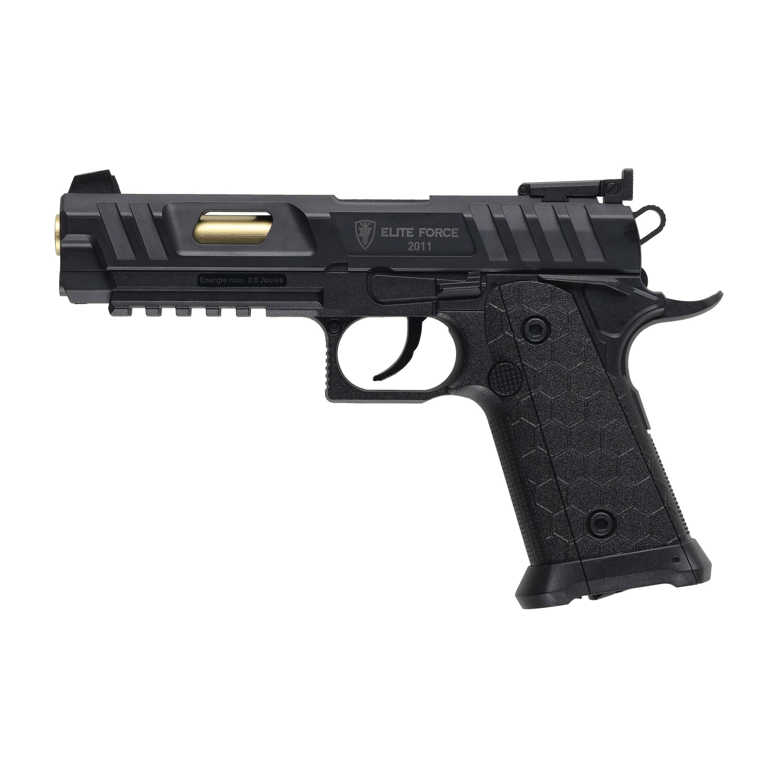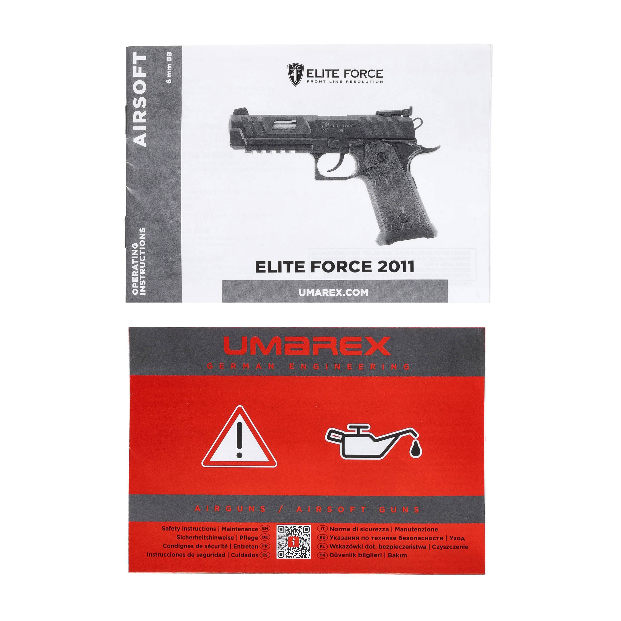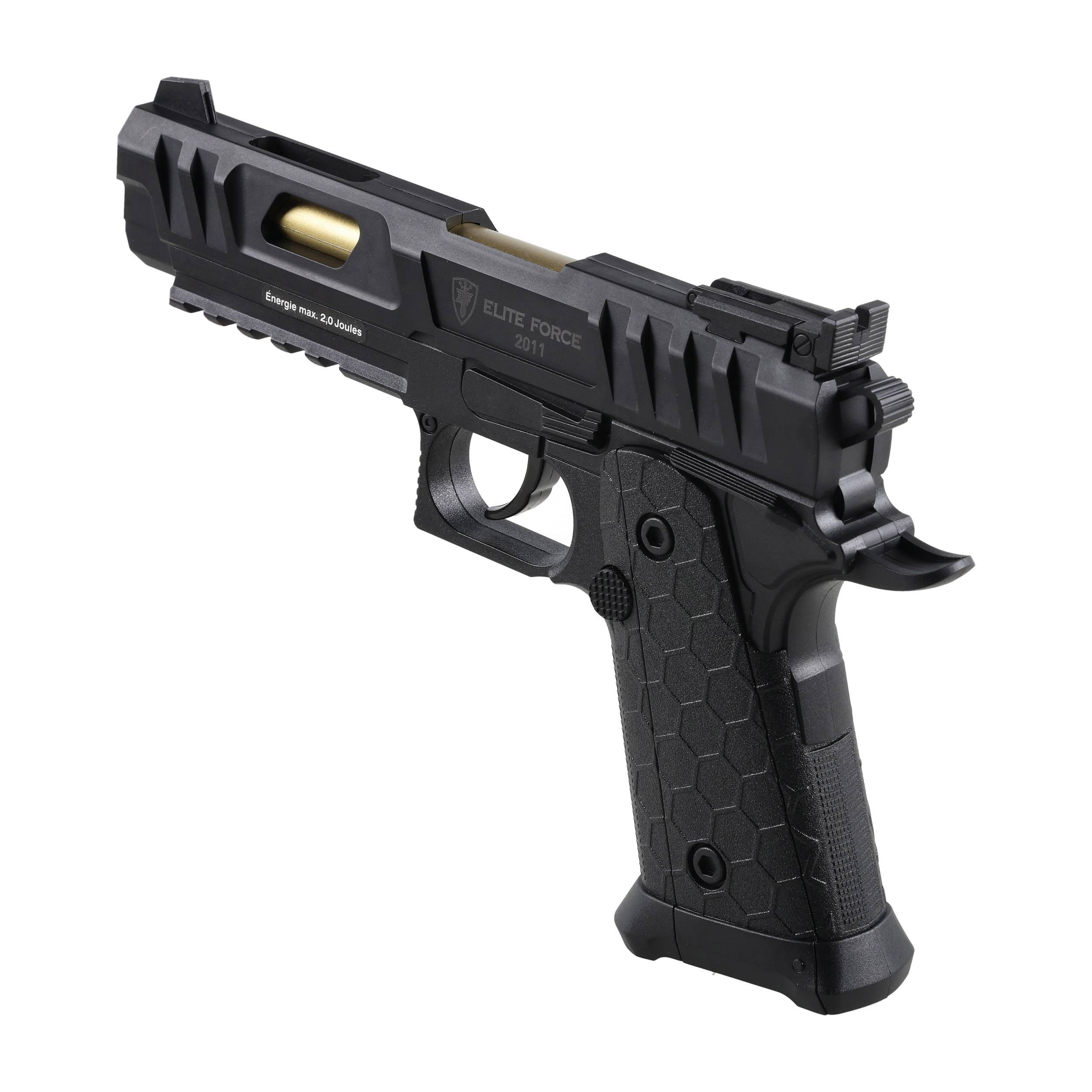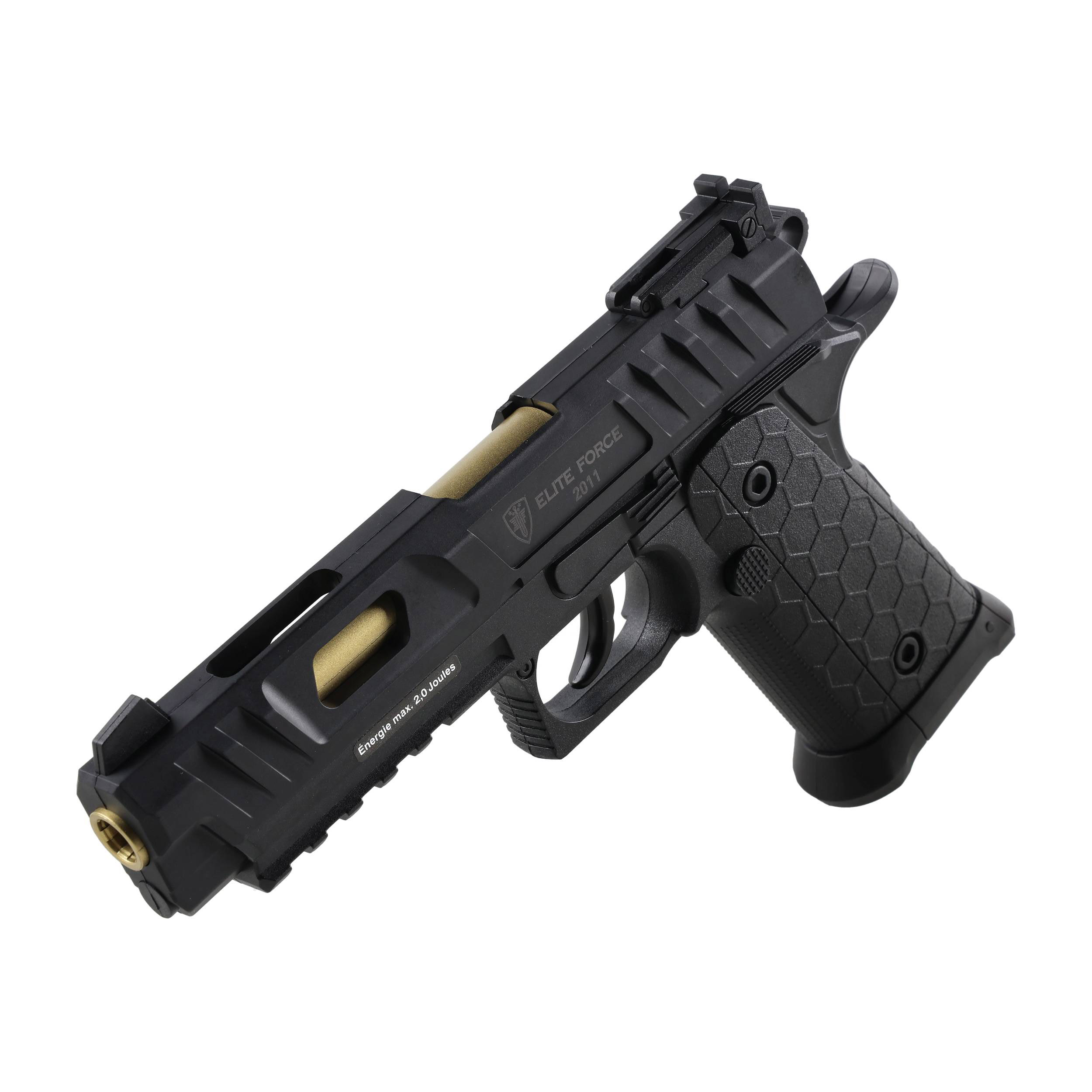 Pistolet ASG Elite Force 2011 w kalibrze 6 mm BB to ulepszona replika klasycznego Colta 1911, którą dostosowano do nowoczesnego pola walki, wprowadzając szeregusprawnień oraz poprawiając ogólną ergonomię. Zmodyfikowaniu uległ chwyt, który wyposażono w lejek ułatwiający załadowanie pojemnego magazynka, a okładziny wyposażono w antypoślizgową teksturę o strukturze plastra miodu. Dodatkowo zamek maodciążające wycięcia po obu stronach, które dodatkowo zwiększają powierzchnię, którą można przeładować wygodnie pistolet. Przedstawiona replika jest wersją non-blowback zasilaną za pomocą standardowej kapsuły CO2 12 gramów.