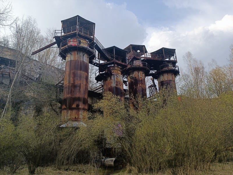 Każdy kto choć raz wspiął się na Kopiec Kraka widział olbrzymie wyrobisko z charakterystycznymi cylindrycznymi wieżami. Są to pozostałości pieców do wypalania wapienia. Pochodzą one z lat 70 -tych XX w. Zastąpiły one starsze piece murowane.
