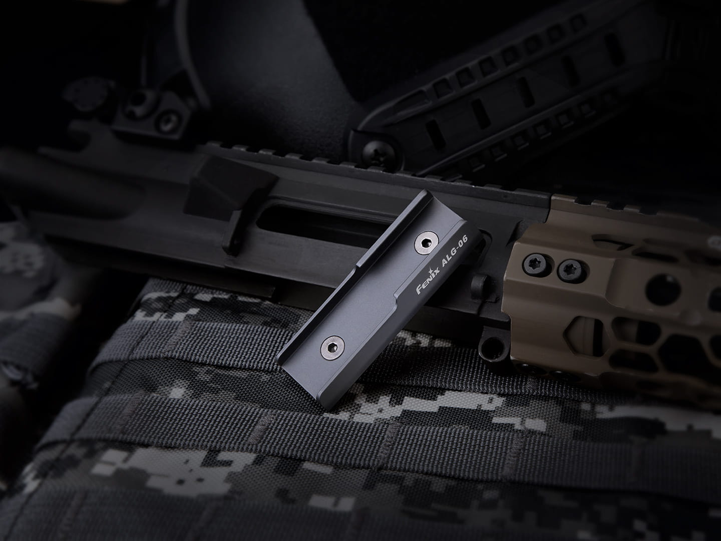 Korpus montażu wykonano ze stopu aluminium A6067-T6, o matowym anodyzowanym wykończeniu typu HA-III. Fenix ALG-05 dedykowany jest do włączników żelowych: AER-02 V2.0, AER-03 V2.0, AER-04 i AER-05 ALG-06 montowany jest na łożu M-LOK za pomocą dwóch śrub oraz samokontrujących nakrętek T-nuts, które zapobiegają przesuwaniu uchwytu pod wpływem odrzutu broni. Przycisk włącznika po wsunięciu do objemy ALG-06 blokują 2 szerokie występy.