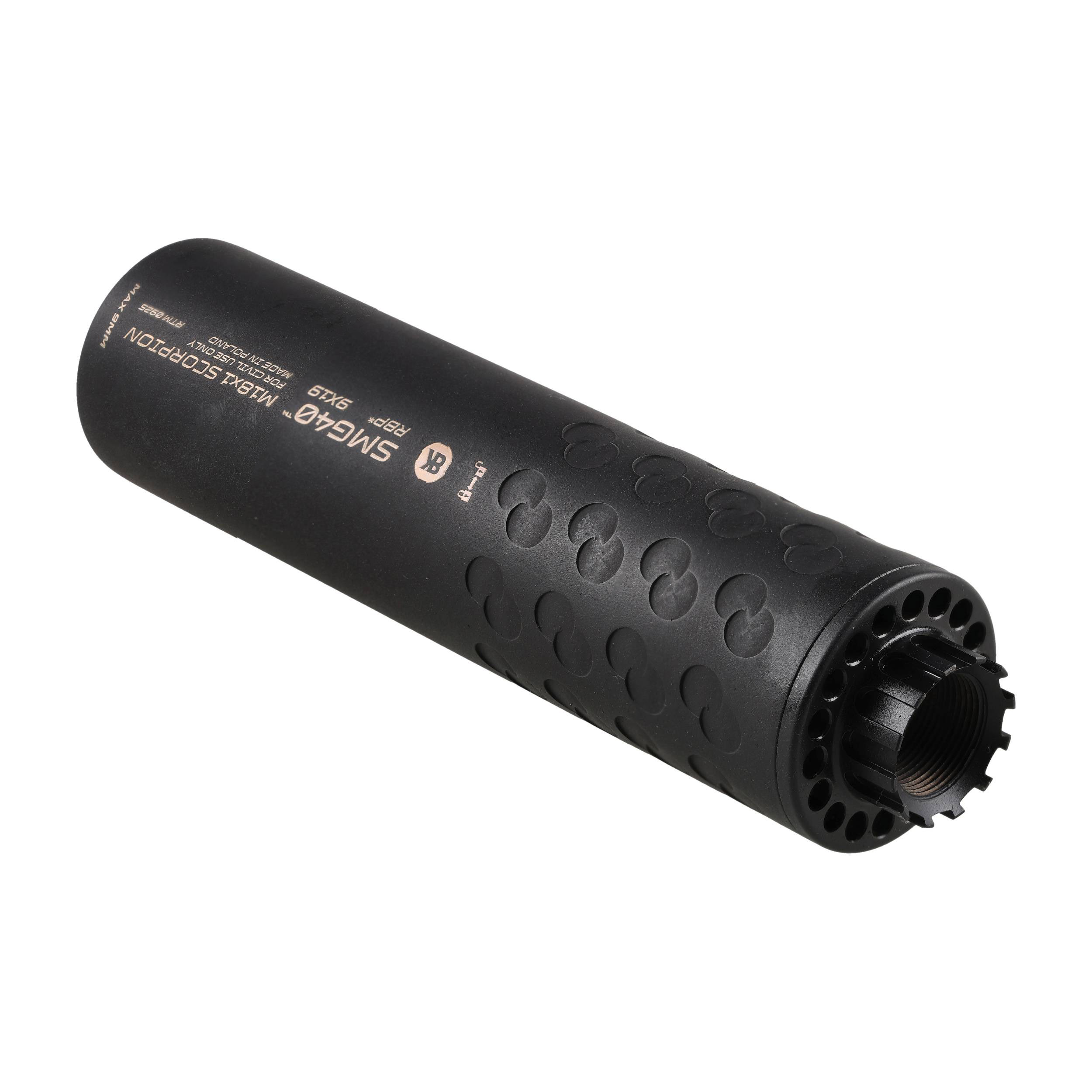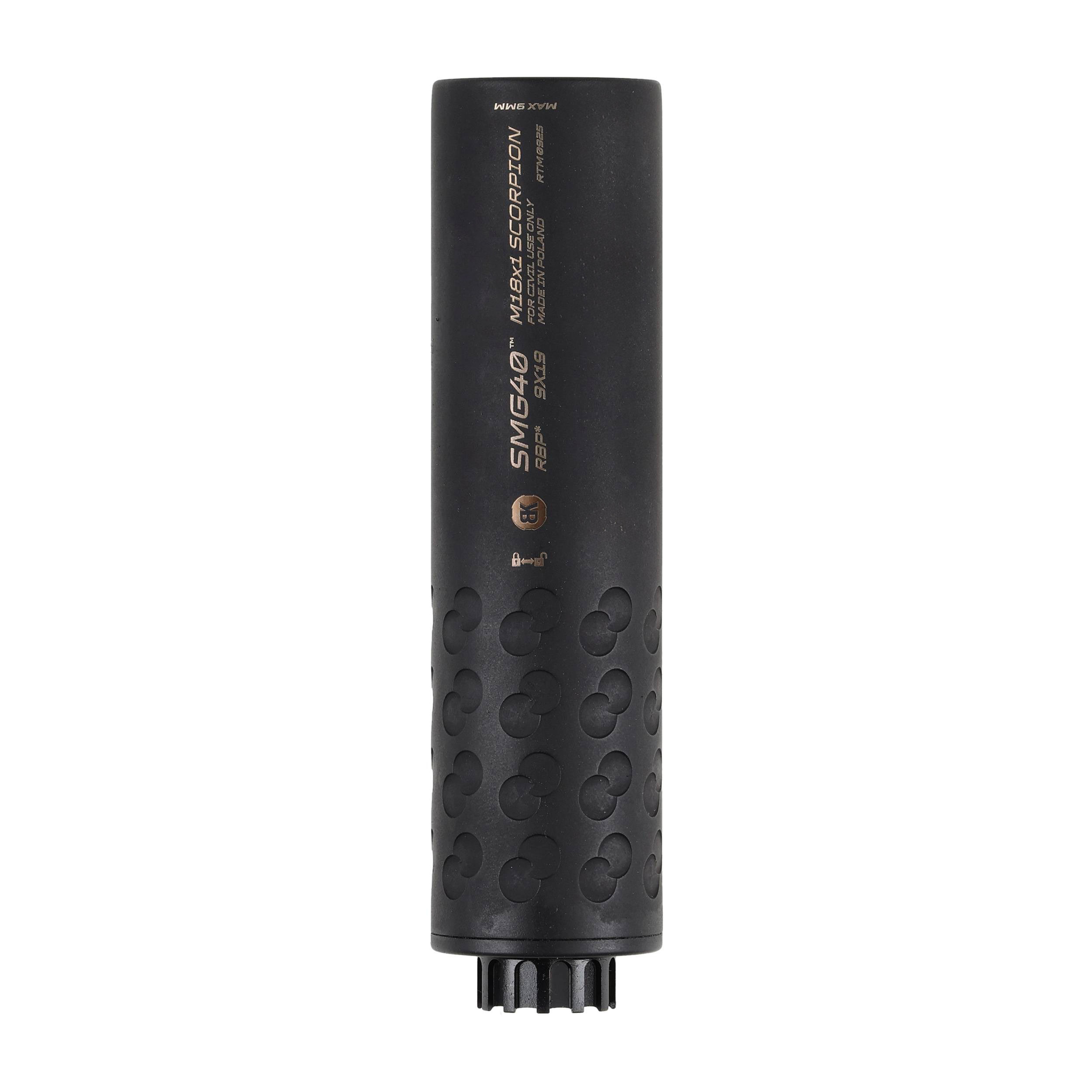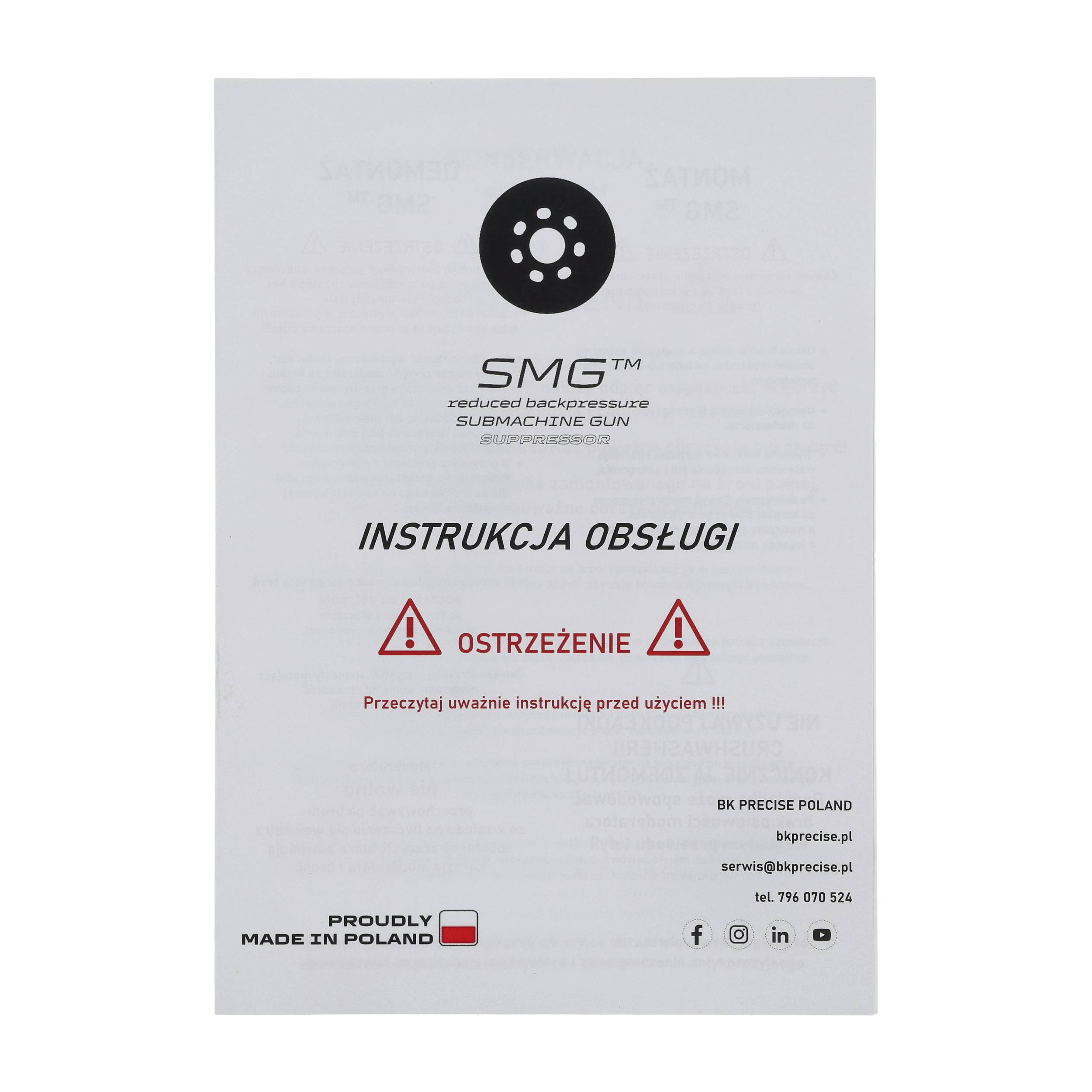 Tłumik dźwięku BK Precise SMG to najnowszy i nowoczesny moderator dźwięku przeznaczony do pistoletów CZ Scorpion EVO III wyposażonych w gwint mocujący M18x1. Tłumik ten łączy sprawdzony kształt i niezawodność z nowoczesnymi rozwiązaniami konstrukcyjnymi. Model wykonany jest w całości ze spawanej stali nierdzewnej, dodatkowo wzbogaconej tytanem dla zwiększenia odporności. Tłumik ten jest w stanie wytrzymać wysoką temperaturę generowaną przy ogniu ciągłym (Full-Auto). Prezentowany model jest w kolorze czarnym.