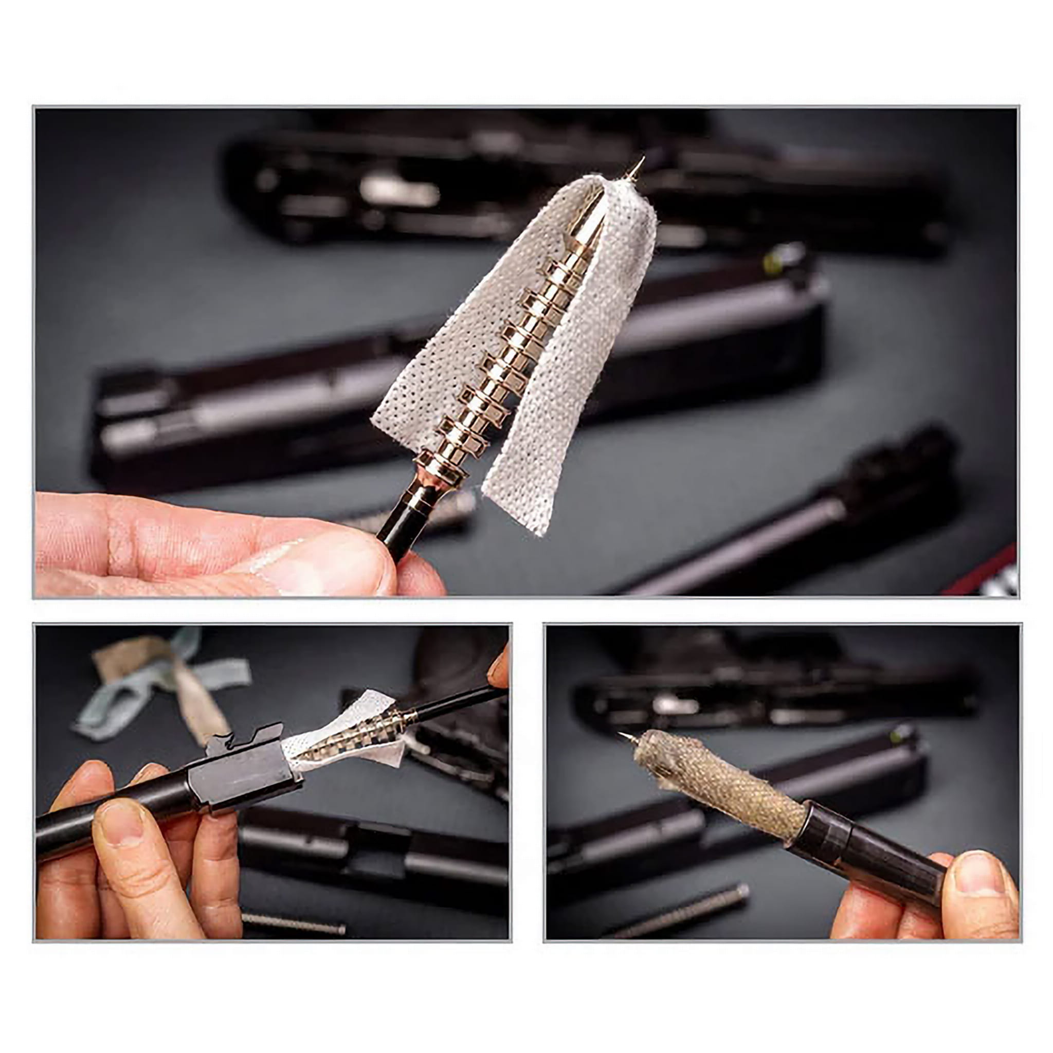 Użytkownik w zestawie do czyszczenia Real Avid otrzymuje szczotkę do czyszczenia lufy i materiałowe przecieraki z uchwytem. Dzięki temu zestawowi każda czynność związana z czyszczeniem lufy broni staje się prosta, szybka i efektywna.