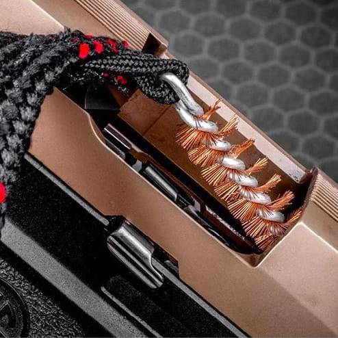 Dołączony w zestawie sznur do czyszczenia lufy Bore Boss wyróżnia się na tle konkurencji niezwykle przemyślanym pojemnikiem, który pozwala na przechowywanie ubrudzonego sznura bez ryzyka zanieczyszczenia otoczenia. Co więcej, element ten służy również jako chwyt, pozwalając na wygodne przeciągnięcie sznura przez lufę. Dzięki połączeniu miedzianej szczotki z plecionym, nylonowym mopem, Bore Boss skutecznie zbiera pozostałości z gwintu, jednocześnie rozprowadzając preparat konserwujący równomiernie po jego powierzchni.
